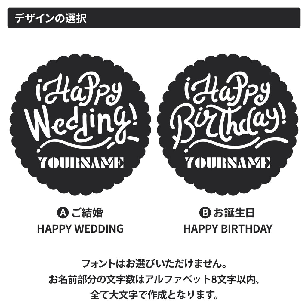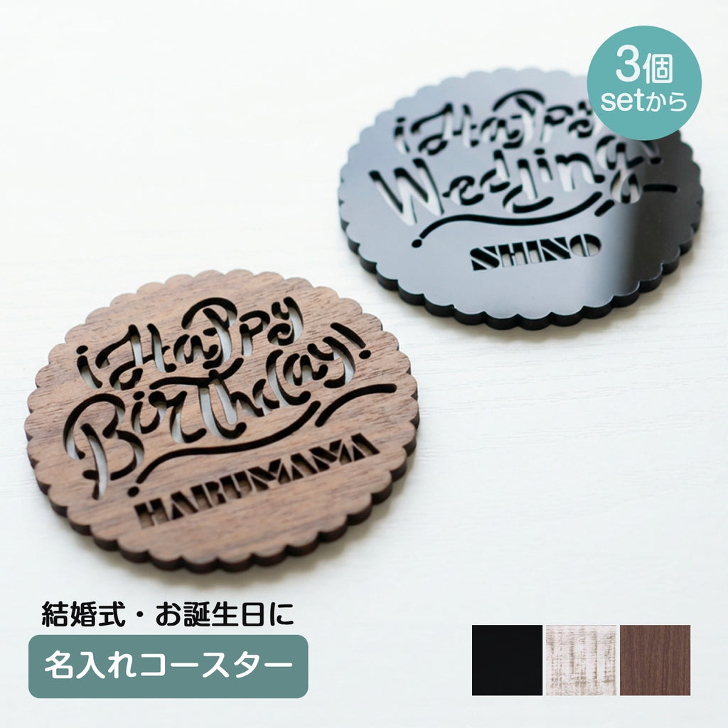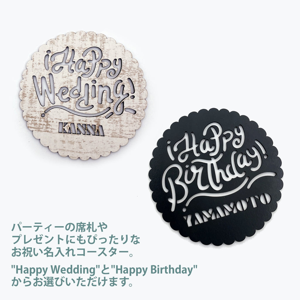 "Happy Wedding"と"Happy Birthday"から選べる名入れコースター。