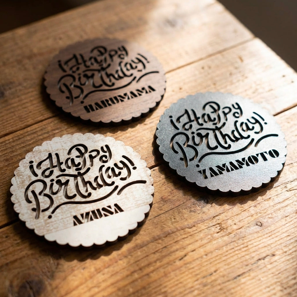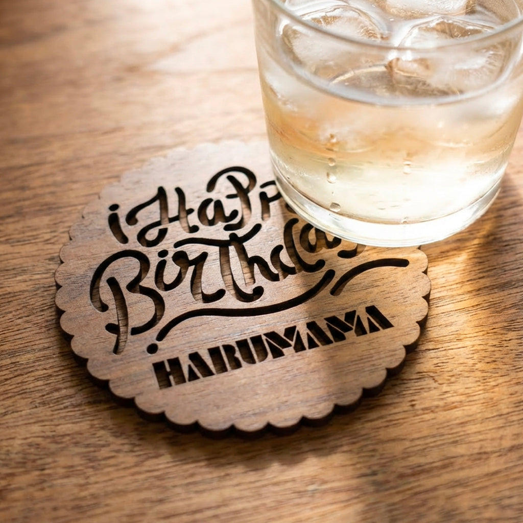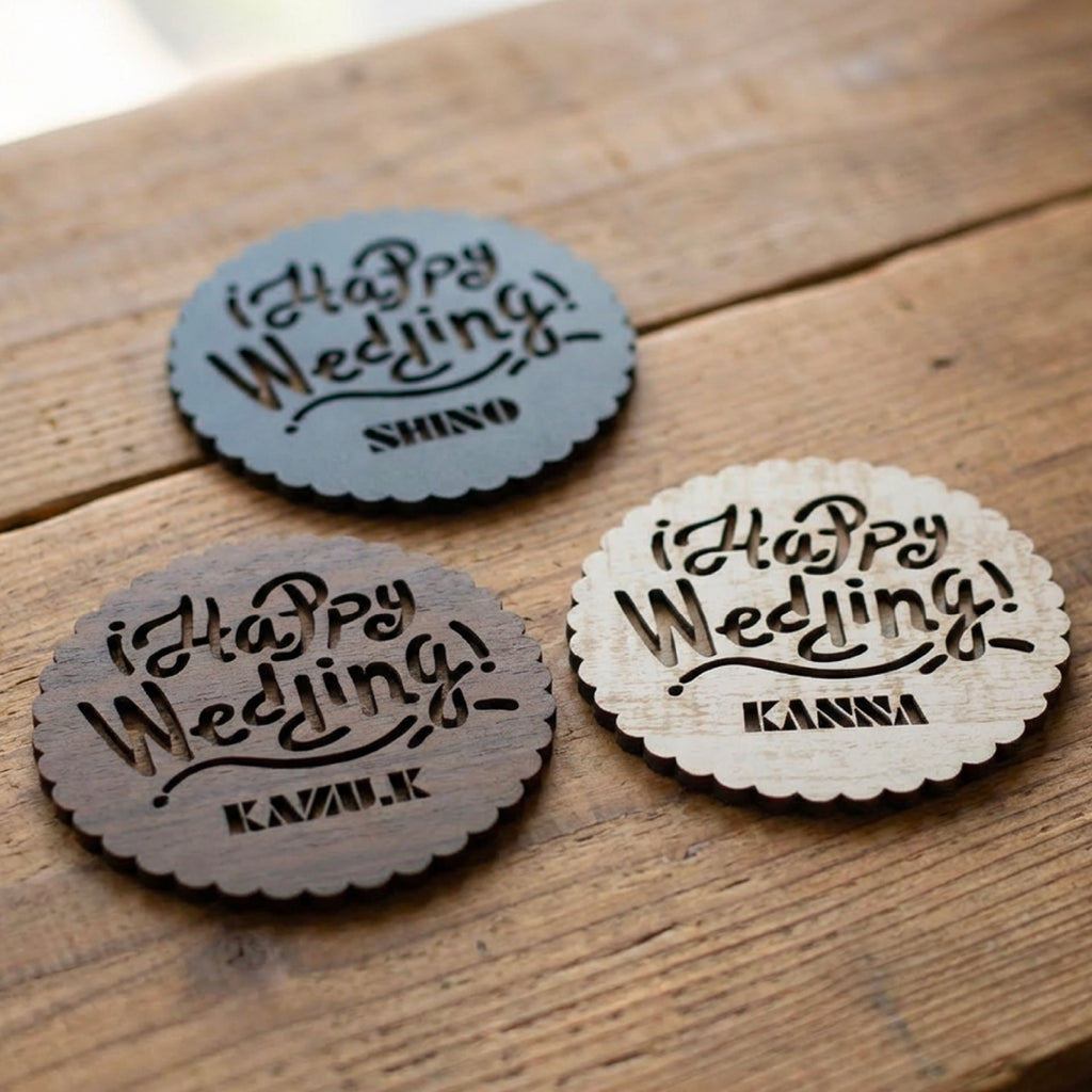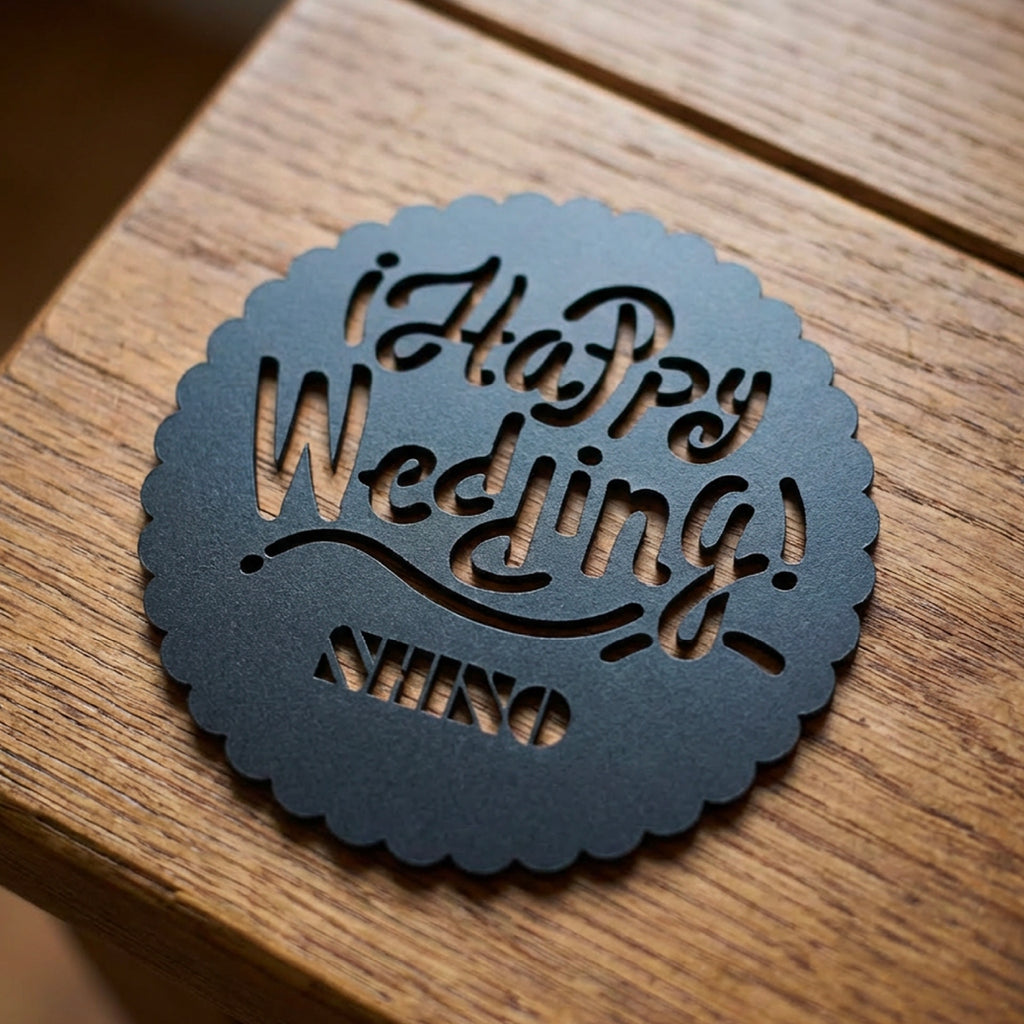 "Happy Wedding"と"Happy Birthday"から選べる名入れコースター。
